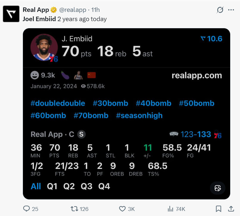 实际上在两年前的今天,恩比德单场36分钟拿到70分18篮板5助攻1抢断1盖帽帮助费城击败马刺,两年过去了恩比德终于再度回到巅峰?