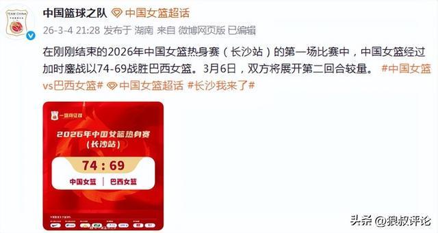 赛后,中国篮协官方社媒发文:在刚刚结束的2026年中国女篮热身赛(长沙站)的第一场比赛中,中国女篮经过加时鏖战以74-69战胜巴西女篮。3月6日,双方将展开第二回合较量。
